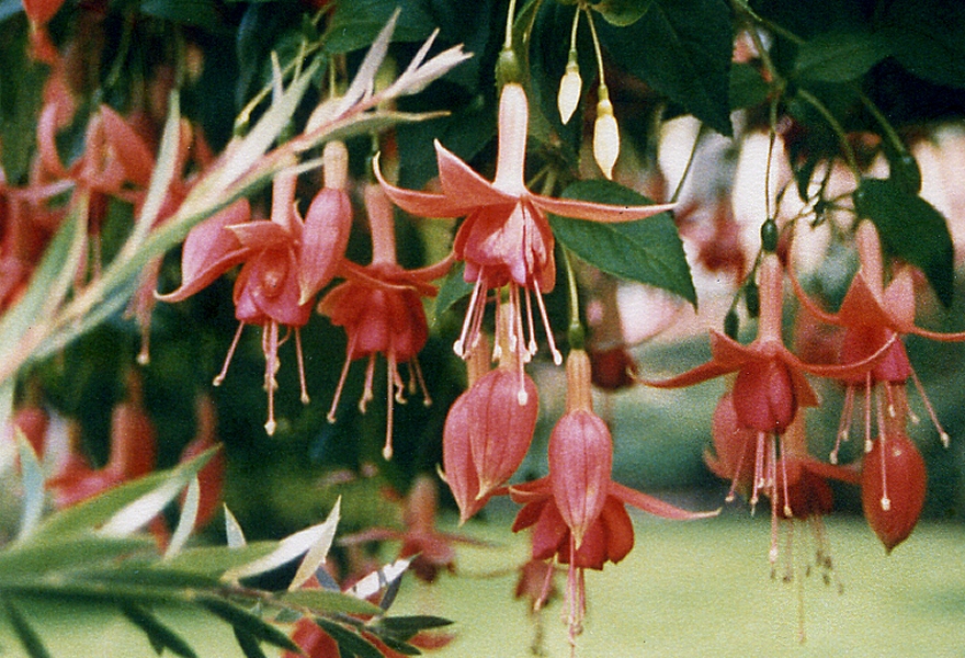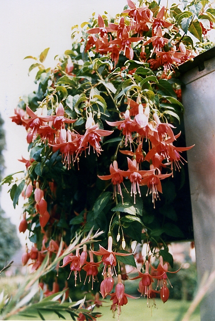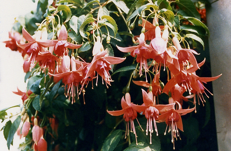 Een prachtige hangfuchsia met oranje getinte bloemen. De plant is mij persoonlijk niet bekend, maar is de zaadgever van 'Dancing Flame' en stuifmeelgever van 'Golden Anniversary'. De foto is afkomstig van wijlen dhr. P. Riekerk, van wiens schoondochter ik zijn fuchsiafotoalbum heb gekregen met de mededeling dat ik de foto's mocht gebruiken. A beautiful trailing fuchsia with orange tinted flowers. The plant itself is unknown to me, but it is the mother of 'Dancing Flame' and father of 'Golden Anniversary'. This photo was taken by the late Mr. P. Riekerk, whose daughter-in-law gave me his fuchsia photoalbum and permission to use the photos. | ![]() |