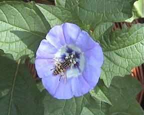 links: Oost-Indische kers met bont blad, en rechts: Nicandra physaloides met zweefvlieg.
