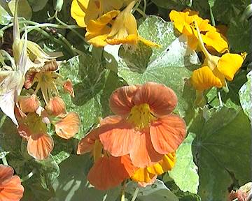 left: Nasturtium with variegated foliage; right: Nicandra physaloides with hoverfly.