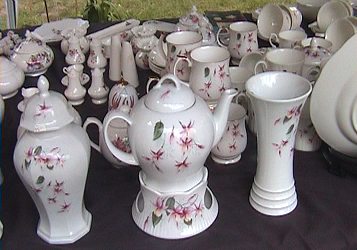 left: English bone china with fuchsia design; right: Sign of a bee-keeper selling honey and -products.