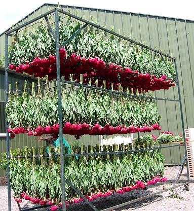 Above two examples of these flowers, left white roses, freshly cut, and right red peonies hanging upside-down on a rack to dry.