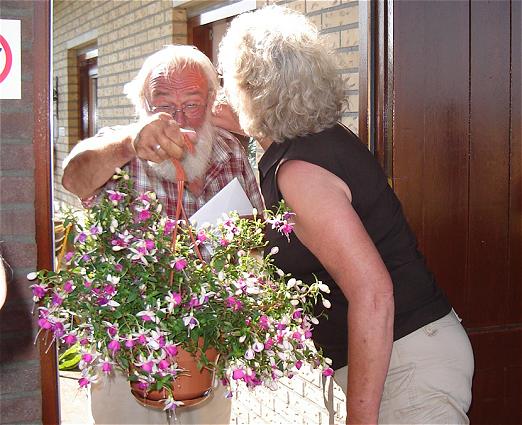 Anneke Faber, who had organized the trip together with her husband Jurjen, here offers him a big hanging-basket with fuchsia 'La Campanella'.