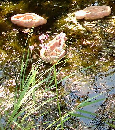 Links: Beeldje 'Lovebirds' van R. Mukwaira; Rechts: Kunststof oren drijvend in tuinvijver.