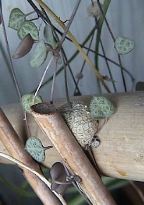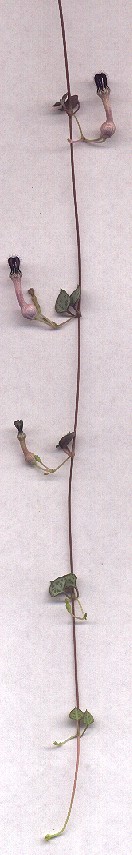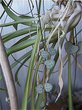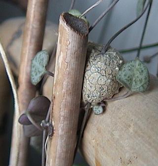 This trailing plant, originating from Natal, S. Africa, hardly needs any water; it has very slender stems with small thick speckled leaves and tubers, which make roots when finding soil to grow in; sometimes they attach themselves to something else too, as is to be seen in the pictures below - a rather big tuber tightly rooted in a cane plantstand.