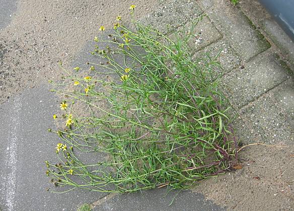 Narrow-leaved ragwort, as a wet broom (= bezem in Dutch) on a wet parkinglot in Amsterdam. Seeds often take a lift within the profile of the tyres of cars, I read recently, which makes a parkinglot or highroad a very probable future growing-place. |
