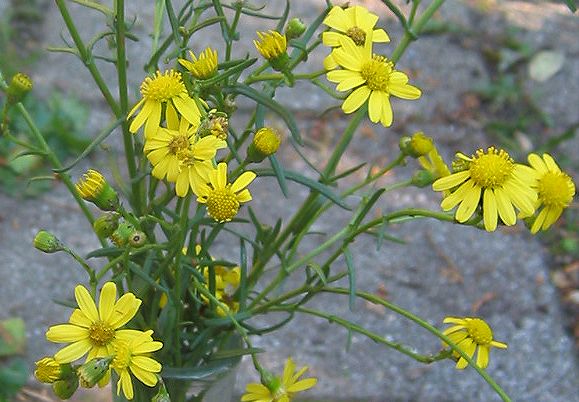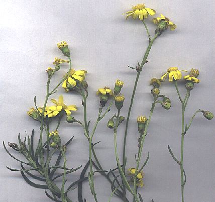 A scan (4 x enlarged) of stems and foliage. The leaves are thick (a bit succulent) and very narrow (linear), with only on a few of them some "teeth" at the base. 26-2-2004 : Plant identified - (continuation) However, it proves to be one of the quickest-spreading weeds in Europe, and hard to eradicate. After its arrival together with wool imported from South-Africa about a century ago, this ragwort only grew in Mediterranean regions to start with, but during the last thirty years it has spreaded more and more over Europe. Among others in France, Germany and Switzerland the plant is regarded as a threat to the natural flora and to cultivated crops. It is poisonous, like all ragworts it causes damage to the liver, and can be lethal to cattle and even to people. The fact it has spread that much during the last few decennia is said to be a result of the warming-up of the earth, but you could imagine the plant also gradually has adapted to colder circumstances - the seeds on their little umbrellas drift everywhere, those falling down in colder areas won't all grow up, but some of them will, namely the hardiest ones. On these plants, seeds will grow containing this quality as well, being blown farther north, and the same natural selection is repeated. The plant produces a lot of seed, every generation adapting a little more, so that by now it's growing well in the Netherlands too, where winters can be really frosty sometimes. A high adaptability often is a feature of the true weed. Senecio inaequidens feels at home in stony, almost impossible spots and burning sunshine - an inheritage from its native country, South Africa. It is also equipped with narrow, succulent leaves that can store the moisture available for a long time. In Europe the plant feels especially happy along railways and motorways, modern deserts of stone created by man himself. Moreover, it gets hardly any competition from other plants there. |