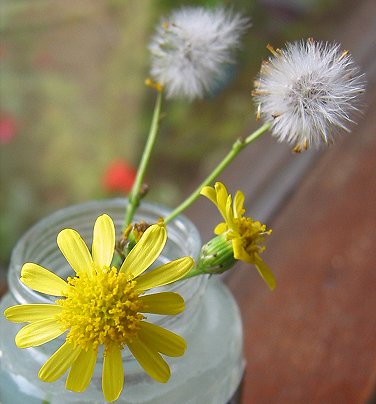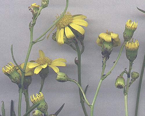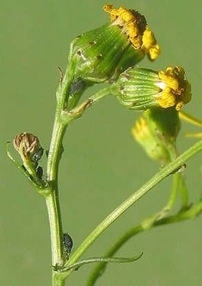 The sunny yellow flowerheads are rather irregular in shape, giving a "ragged" and real weedy accent. Moreover, they prove to be a favourite to black aphids (Aphis fabae) - see scan above (± 3 x enlarged) and photo right below. |