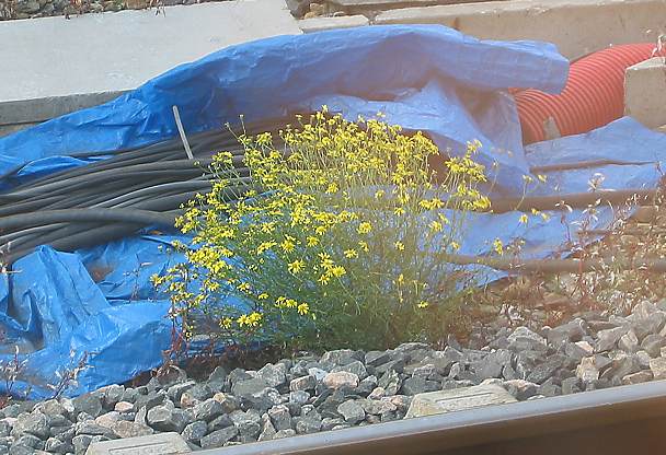 | Dit verhaal gaat verder, want tijdens een treinreis naar Amsterdam (midden oktober 2003) zag ik 'm weer staan, heel groot en wijdvertakt nog wel - deze plant blijkt bepaald niet zeldzaam te zijn, en wordt vooral aangetroffen op steenachtige plaatsen waar lang niet elke plant zich thuisvoelt. Wegenkruiskruid of Puinkruiskruid zou een mooie benaming kunnen zijn. |