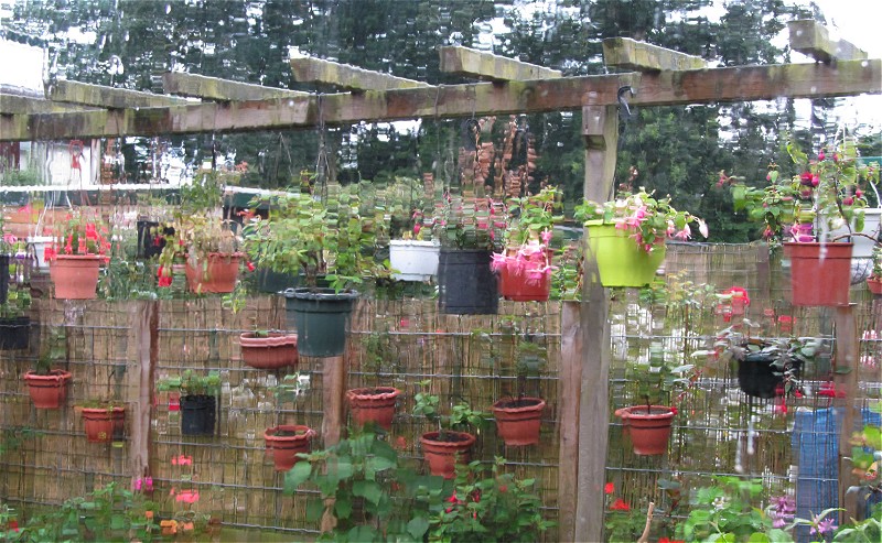 Hierboven een treffende foto van mijn pergola en de schutting waaraan verscheidene potten met fuchsia's hangen - weinig bloei in de afgelopen nep-zomer, met al die regen, vaak lage temperaturen en weinig zon.